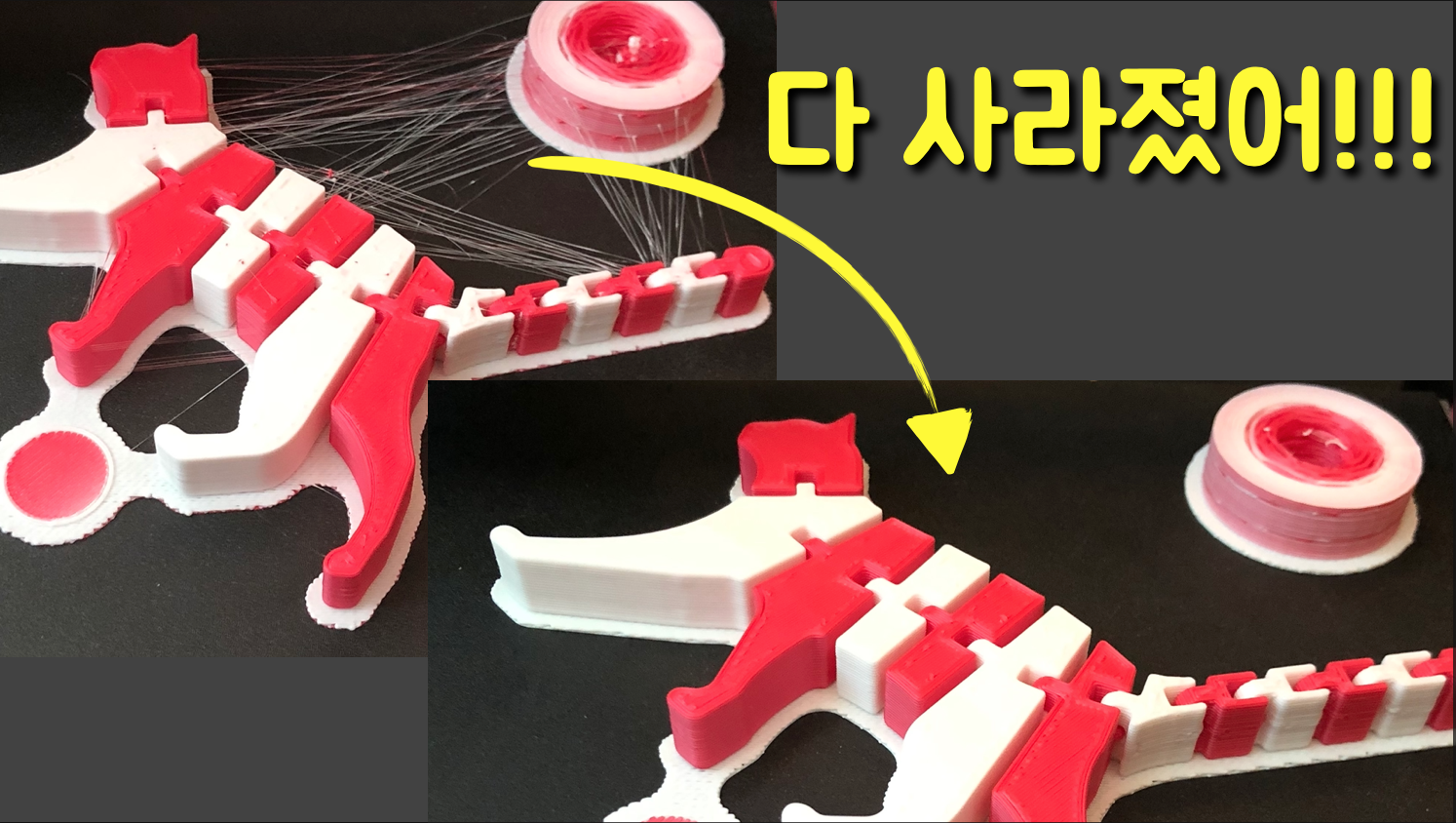 거미줄이 왜 생기는 걸까? 고민이 되었습니다. 싱글 프린팅이라면 노즐을 다시 분해해 보고 했을텐데 Y 스플리터 방식의 멀티프린팅이어서 흰색만 유독 거미줄이 심한건 슬라이싱 gcode 상의 리트랙션이 안되서 발생하는게 아닌가 하는 의심을 했습니다.