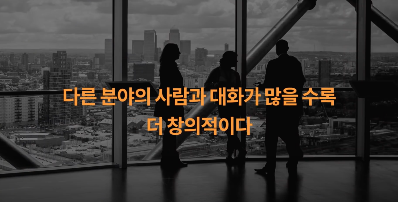 즉, 다른 사람들이 줄 수 있는 혹은 줄지 모르는 아이디어의 핵심요소를 얻기 위해서 타인과의 소통이 필수라는 것이다.