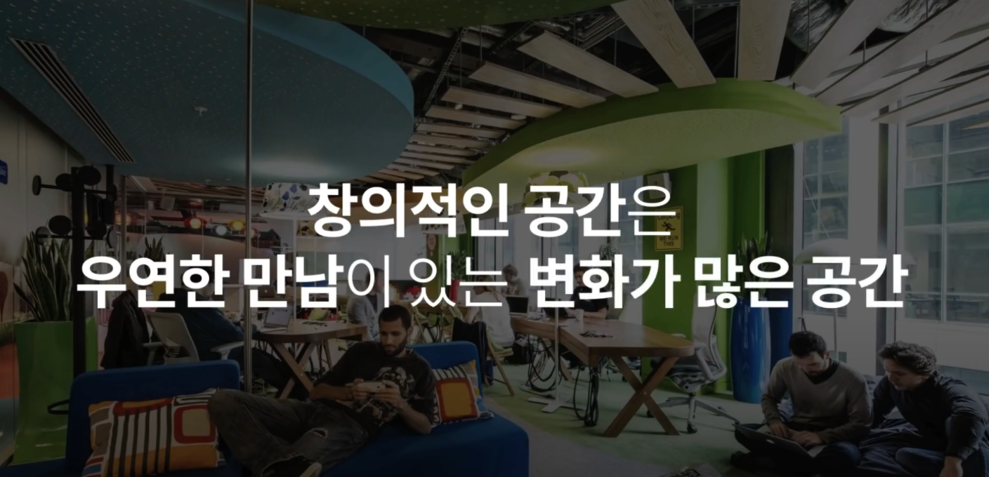 유현준 건축가는 변화가 많은 곳이 창의적인 공간이라고 말하며 그 하나로 자연을 들고 있다. 이것은 필자의 앞선 글에서 산책이 창의적 생각을 이끌어낸다고 한 내용과 일맥상통하다고 보인다. 시시각각 변화가 있고 우연적 만남이 있는 자연과 마당 그런공간에서 새로운 생각이 훨씬 잘 일어나게 되는 것이다. 그래서 회사를 배경으로 한 드라마에 보면 직장인들이 옥상에서 대화를 나누는 장면이 자주 나오는데 그곳이 천정고도 높고 (아얘없고) 자연의 변화가 시시각각으로 다가오는 창의적인 공간이라고 한다. 덧붙여 이런 공간이 일터내에 많아져야 사람들이 창의적인 아이디어를 더 잘 낼 수 있게 될 것이라고 주장한다.