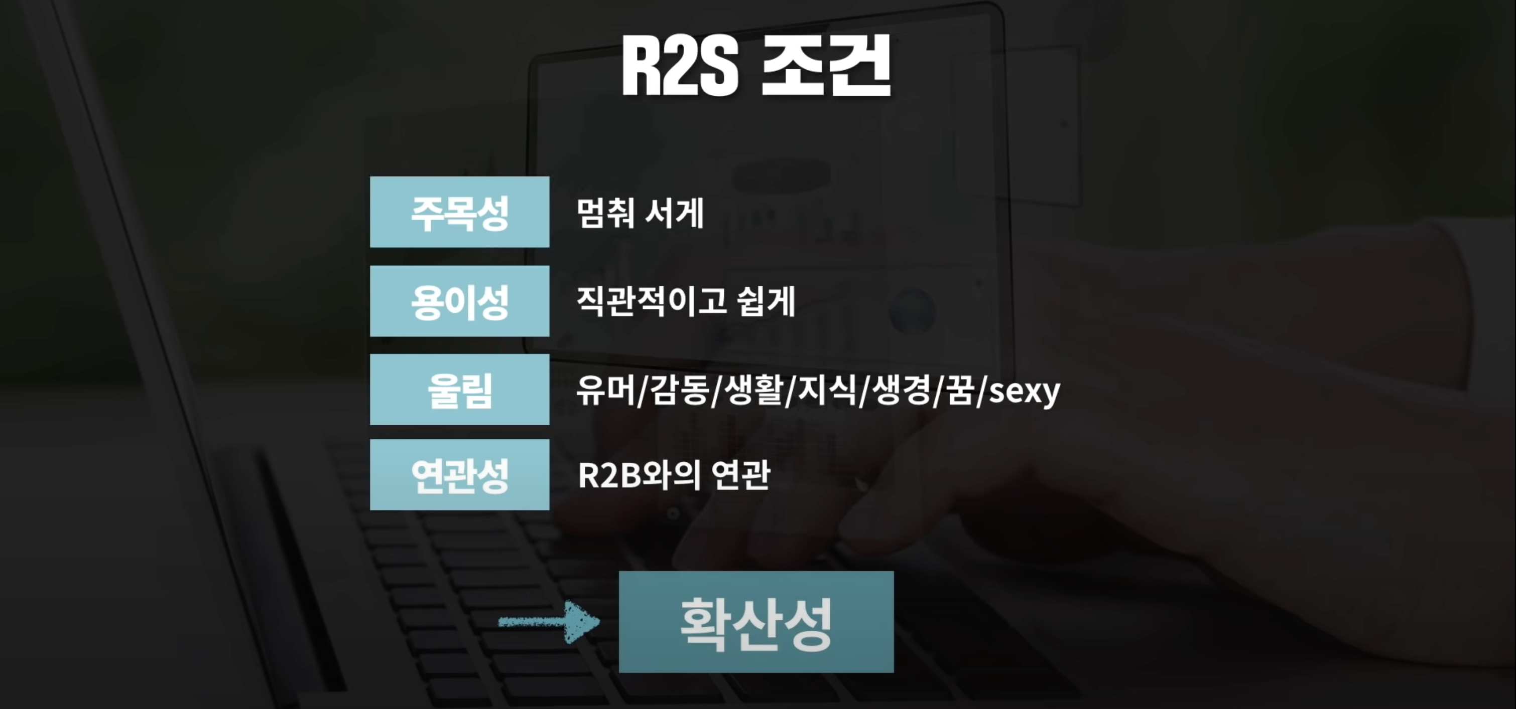 이렇게 변하게 된데에는 매체환경이 달라졌기 때문이다. 과거에는 라디오, TV, 신문, 잡지 등의 매체들에 자본을 투입하여 광고를 하던 시대였다고 한다면, 이제는 소비자들이 주체가 되어, 리뷰를 남기거나, SNS 로 퍼나르거나, 소비자들이 연결된 집단으로 활동하기도 하는 시대가 되었다는 것이다. 그래서 상품을 만들고 그것이 많이 알려지길 원하는 기업은 R2B 를 하는 것이 아니라, R2S 를 해야 살아남을 수 있다고 말한다. 이러한 R2S 가 될 수 있게 하는 컨텐츠의 조건은 무엇일까? 황보현 강연자는 다음과 같이 정리하였다.