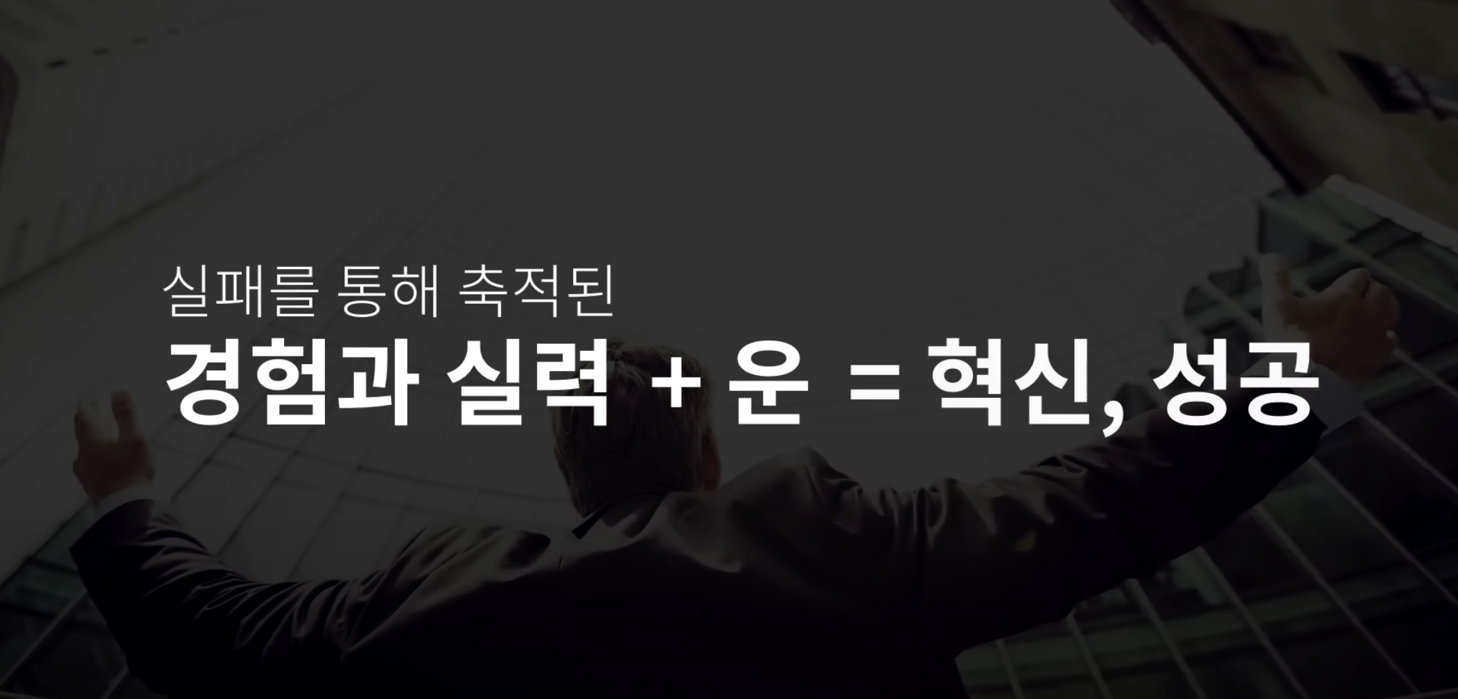 넷째, 실패를 겪었다. 김태용 대표는 한번에 실패없이 성공하는 사람은 1%도 되지 않는다고 말한다. 그리고, 성공이란 실패라는 경험을 통해 축적된 실력과 운이 합쳐져 만들어진다는 말을 이어간다.
