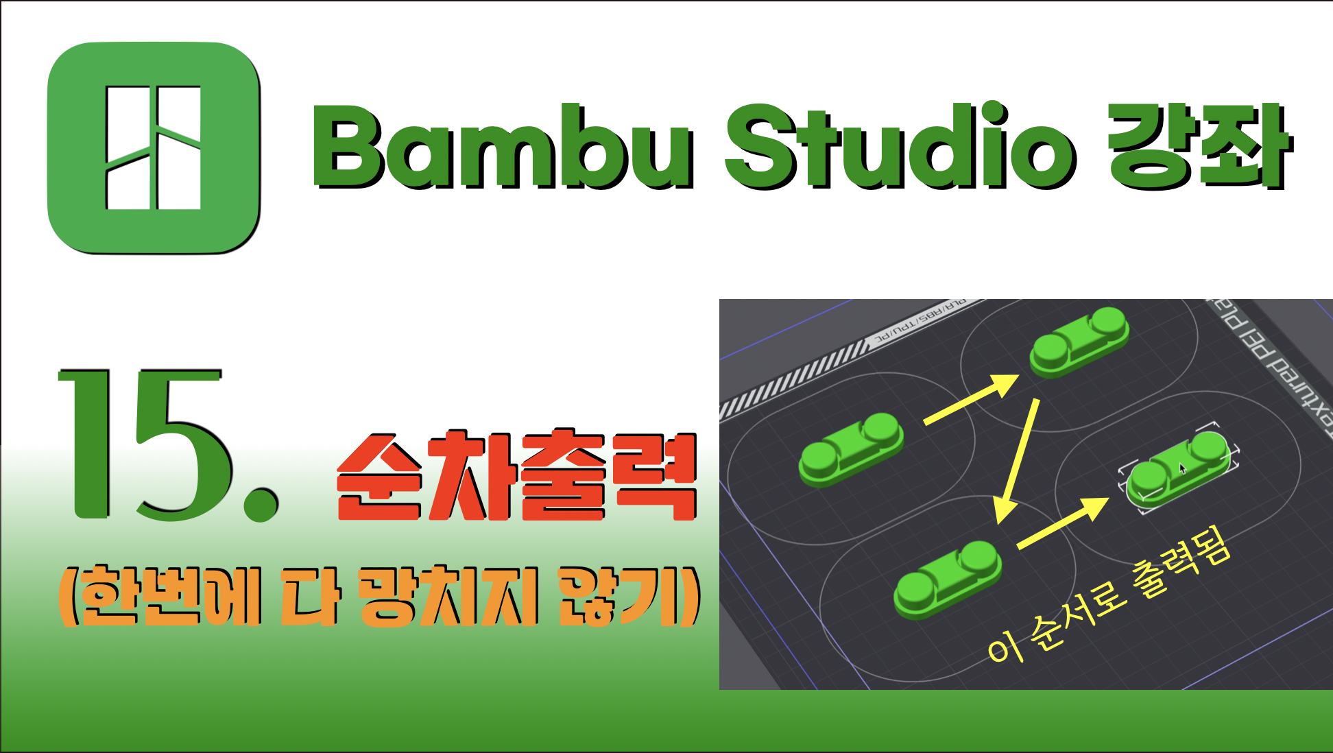 한판에 여러개를 출력하다보면 가끔은 하나가 베드에서 떨어지거나 하면서 나머지까지 영향을 미쳐 결국 전체 출력물이 망치는 경험을 해보셨을 것입니다. 그럴 때를 위해 여러개를 한판에 출력하더라도 동시에 출력되는게 아니라, 한번에 하나씩 출력하는 기능이 순차 출력입니다.