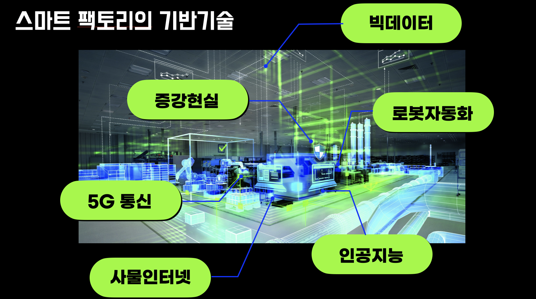 한 때는 공장 자동화만 구축하면 되는 때가 있었다. 하지만, 자동화의 끝판왕이라고 할 수 있는 반도체 공장내에서 근무하면서 단순한 자동화만으로는 한계가 있음을 느끼곤 했는데, 내가 근무할 당시에 라인 전산화라는 이름으로 MES 를 구축하는 TFT 에서 활동하면서 향후 모든 생산라인에 이러한 시스템이 적용될 것으로 예상했고 그것은 현실화가 되었다. 스마트 팩토리라는 것은 빅데이터를 기반으로 인공지능에 의해 최적의 공정조건을 잡고, 문제발생시 신속한 원인파악과 조치로 생산량을 극대화하며 불량률을 줄일 수 있는 생산 구성을 이야기한다. 이것을 위해 여러가지 기반 기술이 필요한데, 그중에 가장 핵심적인 것들을 꼽아본다면 아래 정리한 사진들과도 같다.