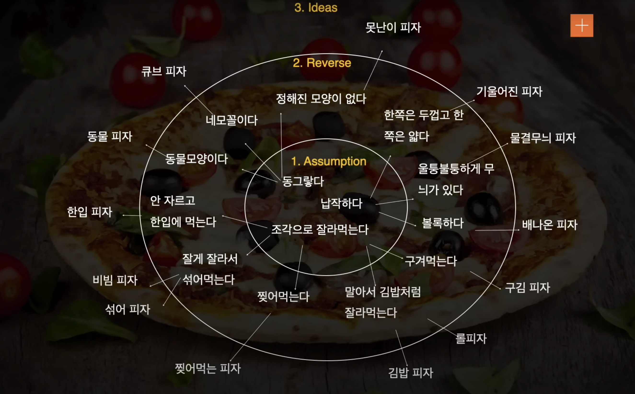 박성연 대표의 촘촘한 단계를 밟아가며 아이디어를 내라고 하는 말은 겉으로 보는 결과가 아니라 순차적인 단계를 거쳐야 함을 말한다고 보였다. 그는 강연에서 새로운 피자를 만드는 상황을 예로 들고 있다. 1단계는 피자에 대한 고정관념을 나열해보는 것이다. 둥글다. 납작하다. 조각으로 나눠먹는다 등의 나열을 해나간다. 이것은 내가 만든 본질씽킹에서 대상의 형식과 형태적 요소를 본질과 분리하는 작업과 같다. 본질은 바뀌면 안되지만, 형식적 요소들은 얼마든지 변화할 수 있기에 고정관념이라 할 수 있다. 그리고, 이것을 기반으로 Reverse 를 정리한다. 형태적 요소로서의 피자는 얼마든지 뒤집고 바뀔 수 있기 때문에 이 작업이 가능하다. 그리고 마지막으로 Reverse 내용을 바탕으로 새로운 아이디어를 뽑아내는 방법으로 이뤄진다.