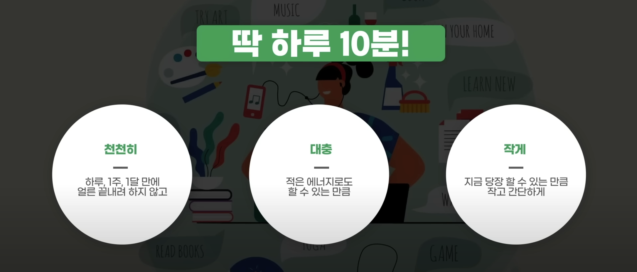 옥대표는 매일 성장을 위해 2시간씩 공부를 하자고 마음을 먹었었다고 한다. 하지만 1달이 지나 받은 성적표는 고작 한달동안 5일만 실천했을 뿐이었다. 그러면서도 매일 계획한 것을 해내지 못하는 자신에게 스트레스 받아가며 살았다는 것을 깨달은 그는 전혀 새로운 방식으로 이 문제를 해결할 생각을 하게 된다. 2시간씩 다섯번을 했다는 것은 10시간을 했다는 말이었다. 그러면 30일로 나누었을때 20분을 했다는 것인데, 괜히 실천하지 못하는 자신에 대해 스트레스 받아가면서 이렇게 할게 아니라, 아얘 소소하고 작게 매일같이 하는걸로 전략을 바꾼다. 이렇게 나온것이 딱 10분 전략이었다.